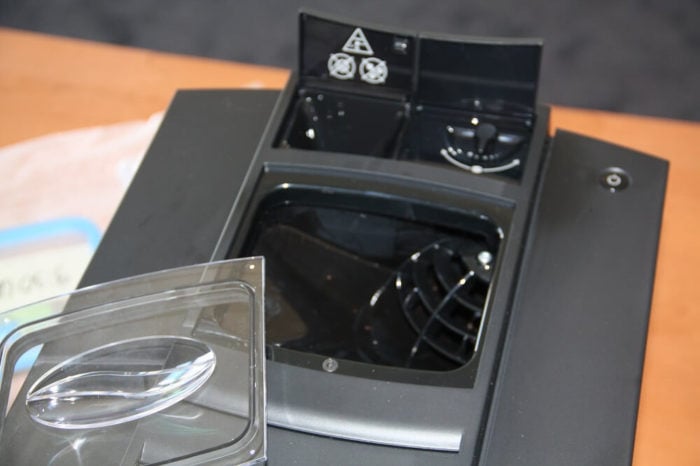 Beim Einfüllen der Bohnen fällt die flache Oberfläche positiv auf, der Bohnenbehälter mit dem transparenten Deckel ragt nicht heraus, sondern liegt schön plan auf. Nachteilig ist allerdings, dass die Öffnung ein wenig größer sein könnte, besonders falls der Vollautomat unter einem Regal oder Ähnlichem platziert wird. Zudem sieht man die eingefüllten Bohnen nur, wenn man von oben darauf schaut und auch dann nur teilweise, da sie im nicht einsehbaren Inneren des Gerätes verschwinden.