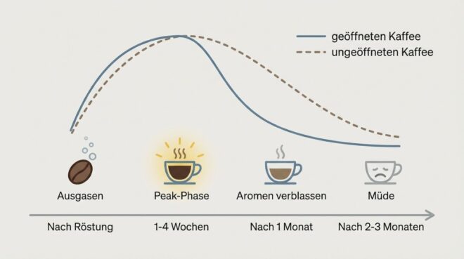 Direkt nach der Röstung müssen Kaffeebohnen einige Tage ausgasen, bevor die sogenannte „Peak-Phase“ beginnt, die Blütezeit des Aromas. In den ersten ein bis vier Wochen nach der Röstung entfaltet der Kaffee seine vollständige geschmackliche Komplexität. Diese Zeitangaben gelten grundsätzlich für den Kaffee ab dem Röstdatum, wobei der Prozess bei einer geöffneten Packung durch den Kontakt mit Sauerstoff erheblich beschleunigt wird. In einer ungeöffneten, hochwertigen Verpackung ist der Alterungsprozess also stark verlangsamt. Auch nach einem Monat ist der Kaffee noch gut genießbar, jedoch beginnen die flüchtigen und feinen Aromen langsam zu verblassen. Der Geschmack wird etwas weniger intensiv und nuanciert. Nach zwei bis drei Monaten hat der Kaffee dann einen Großteil seiner charakteristischen Aromen verloren und schmeckt zunehmend flach, manchmal holzig oder einfach nur noch bitter. Die lebendige Säure und die süßen Noten sind dann verschwunden, und man spricht davon, dass der Kaffee „müde“ geworden ist.