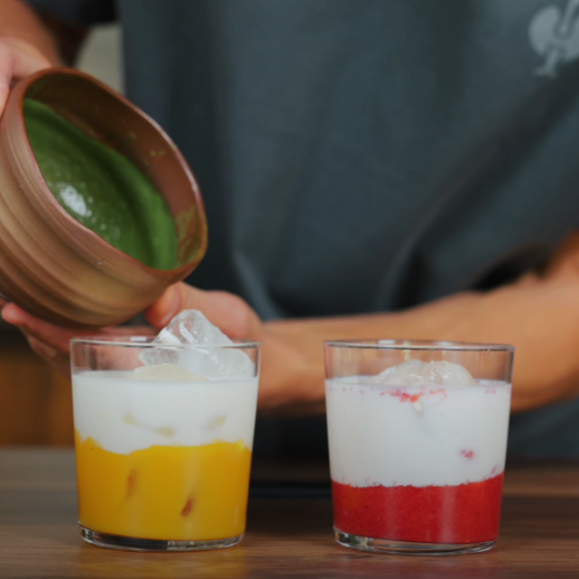 Drei Komponenten bilden die Basis für das Trendgetränk: Fruchtpüree (z. B. Mango oder Erdbeere), Eiswürfel und cremig aufgeschlagene Milch. Abgerundet wird alles mit einer Schicht frisch angerührtem Matcha. Ein dreischichtiger Drink ist nun das Ergebnis, der nicht nur optisch, sondern auch geschmacklich überzeugt.
